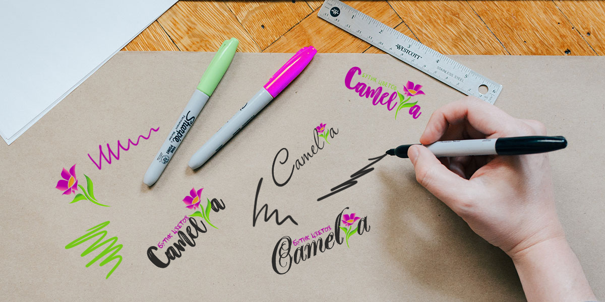 Логотип для "Camelia", соласно технического задания, должен был иметь простую структуру, содержать как графическую, так и текстовую инфрмацию. Т.е. в логотипе должно было фигурировать название бутика, а также элемент, моментально создающий ассоциацию с тематикой компании - цветы. Поэтому на основу логотипа было взято само название, дополненное ярким графическим элементом в виде цветка на ножке.
