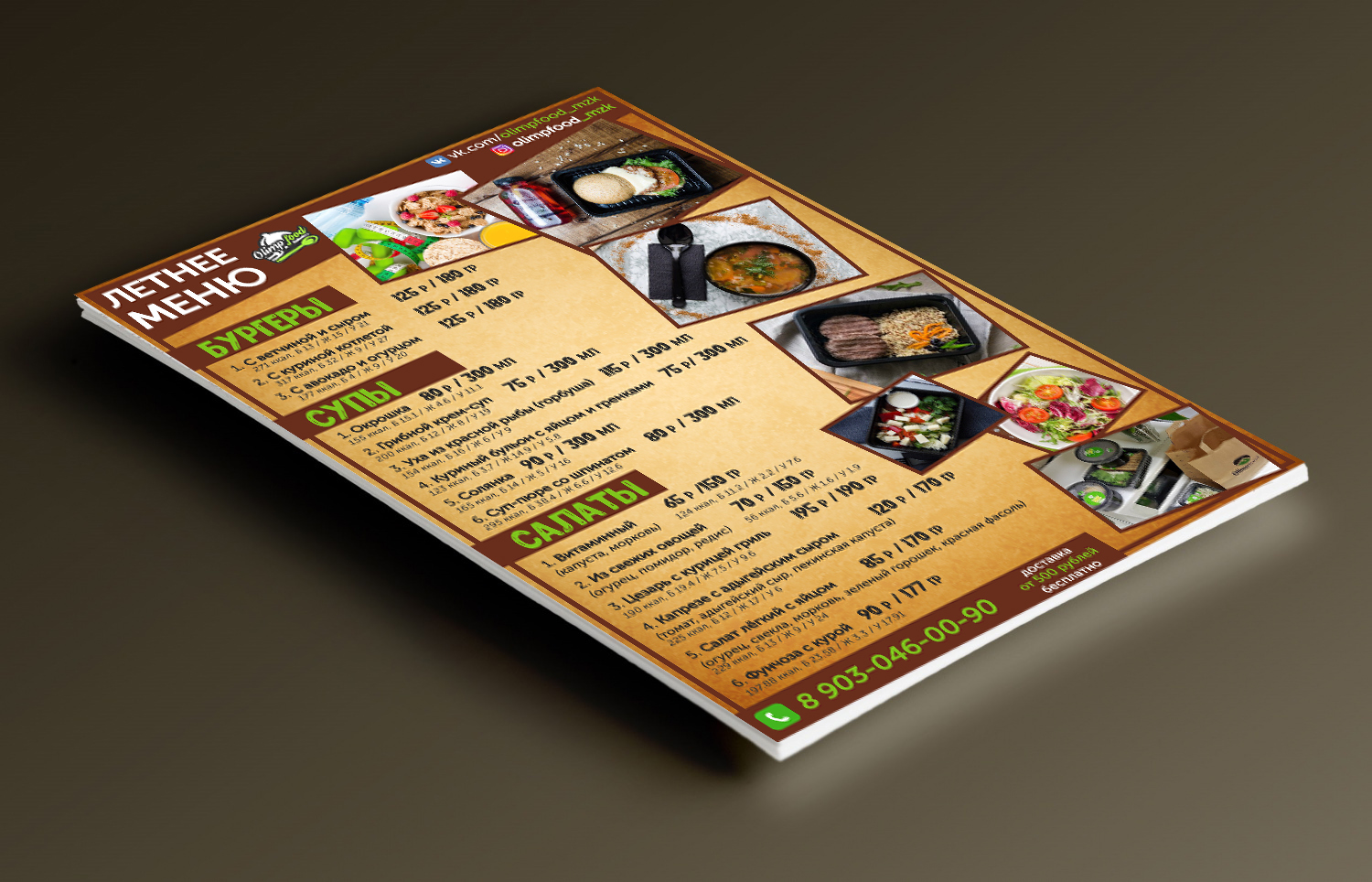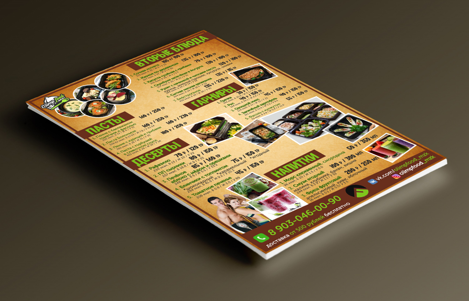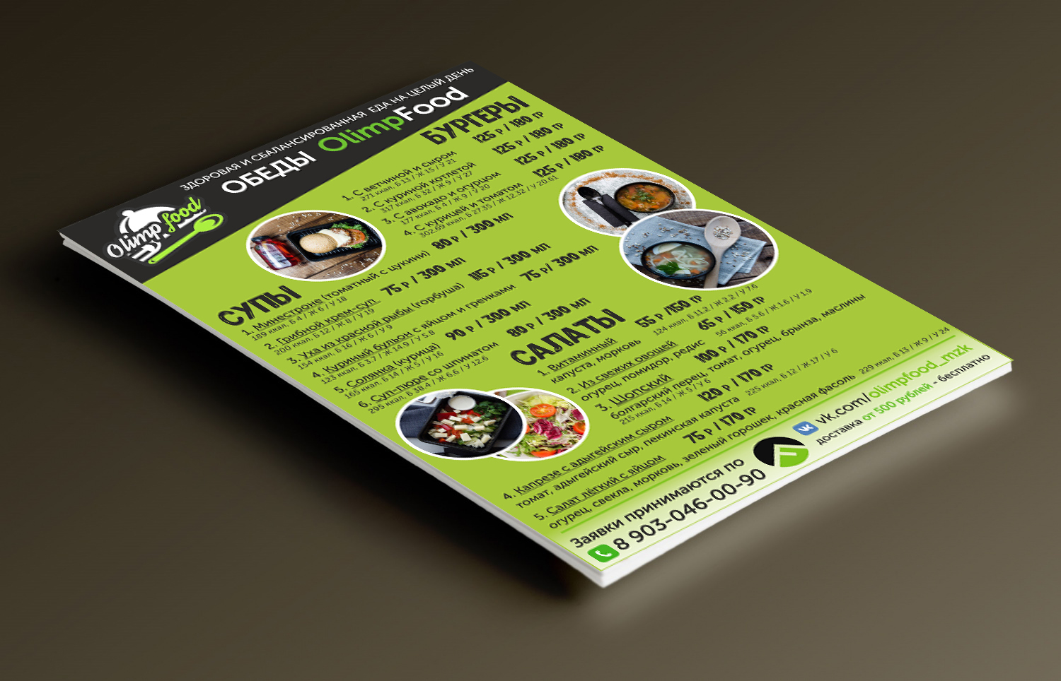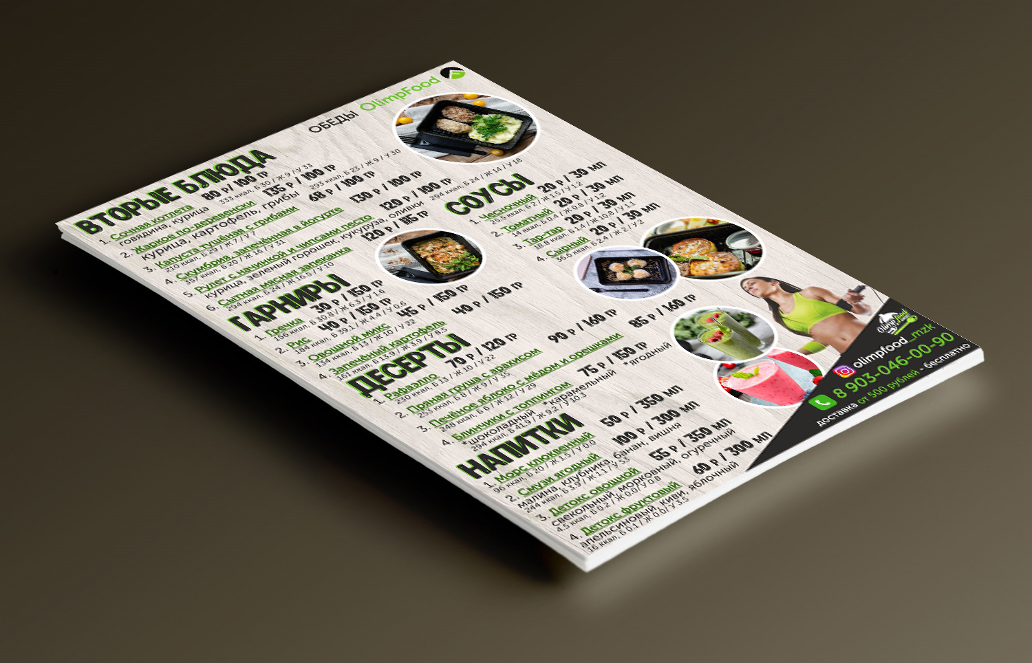 Дизйн разрабатывался в сторогом соответствии с заданием заказчика: использование определенной цветовой гаммы, допусимых вариаций логотипов, готовых графических элементов компании OlimpFood.