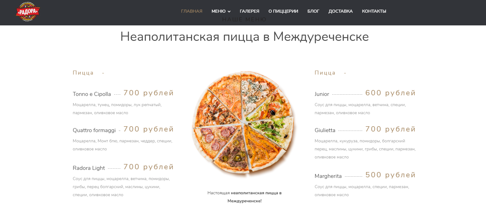 Сайт для пиццерии "RADORA", где готовят настоящую неаполитанскую пиццу на живом огне в дровяной печи