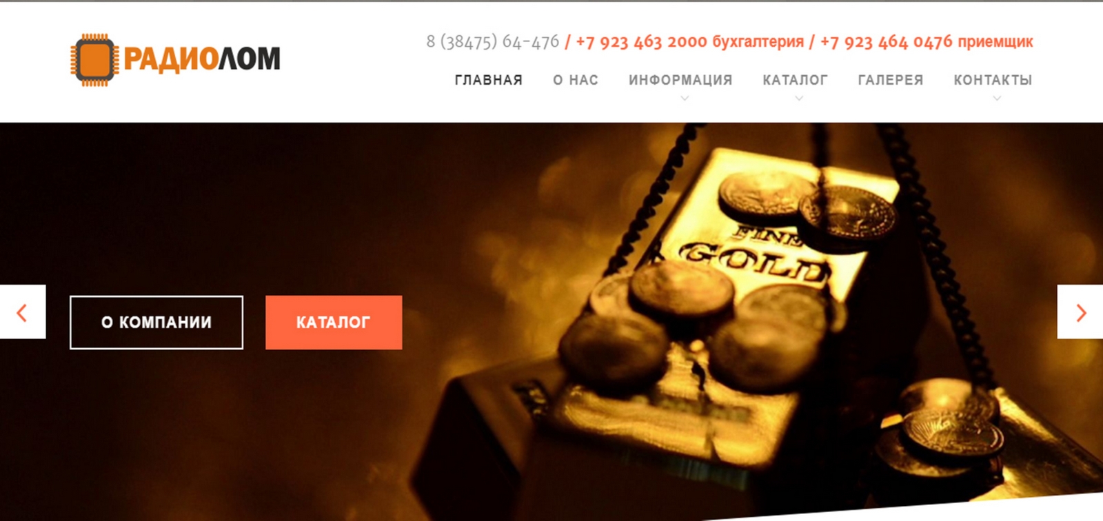 ООО "РадиоЛом" осуществляет покупку радиодеталей, заготовку лома и отходов драгоценных металлов, их первичную обработку и переработку. Компания работает в городах: Новокузнецк, Междуреченск, Ленинск-Кузнецкий, Киселевск, Белово, Осинники.