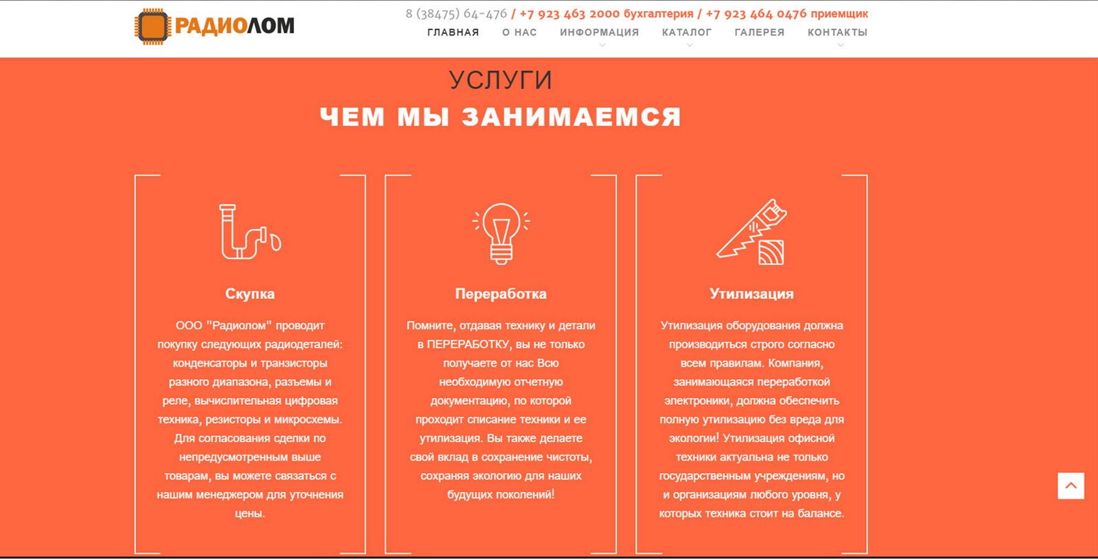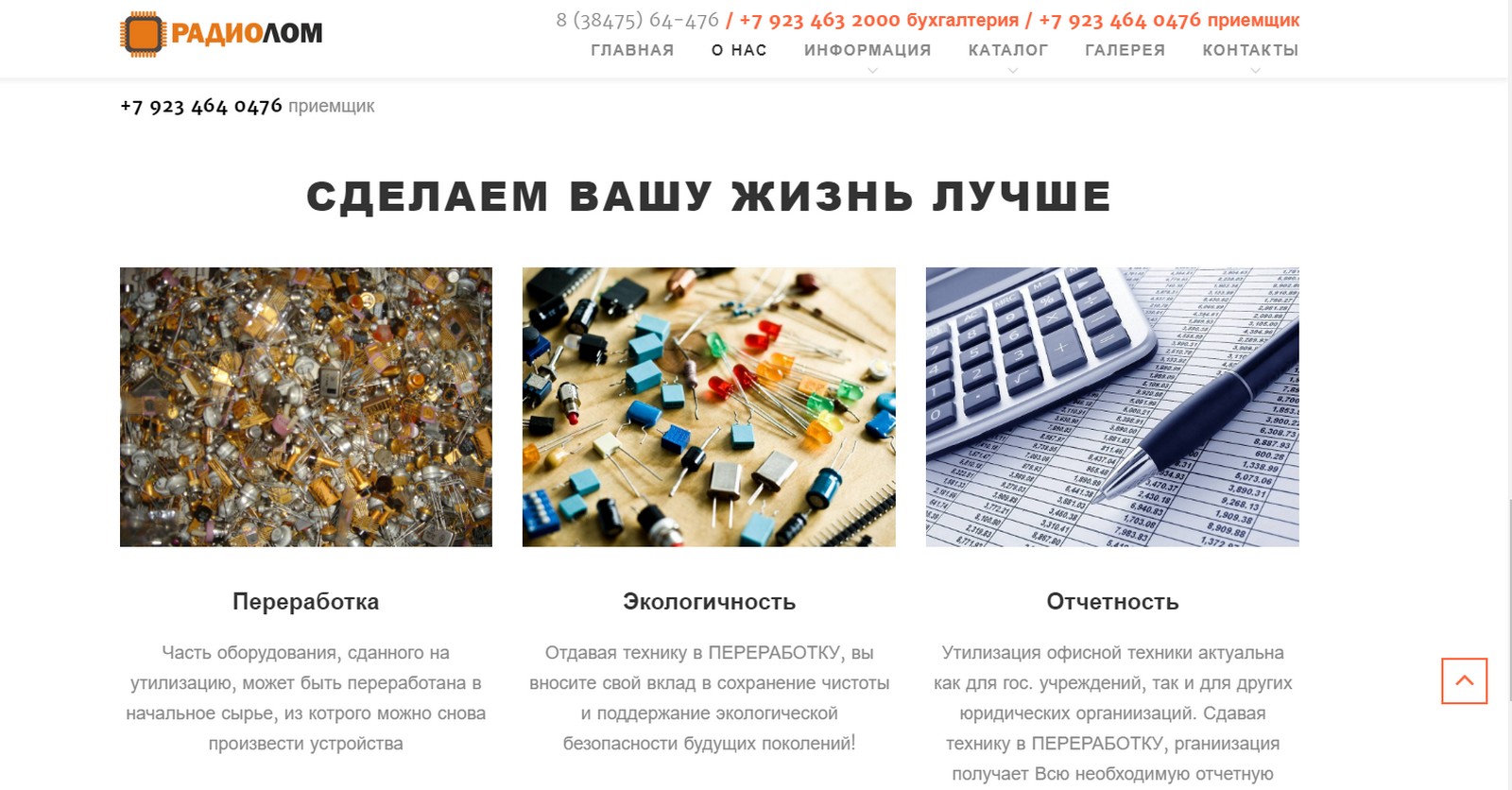 Согласно технического задания, сайт должен был содержать информацию для физических и юридических лиц о возможности сдачи металла и компонентов, цен и условий их реализации. Для этого на сайте создан каталог продукции, а для детального ознакомления с продукцией внедрен модуль «Галерея».
