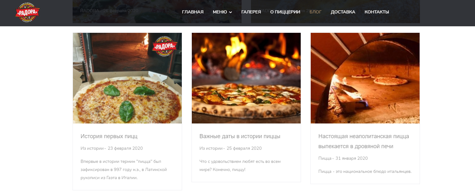 Сегодня специалисты рекомендуют при создании сайта отказаться от стоковых фотографий и не оригинального контента. На сайте пиццерии "RADORA" присутствует фотогалерея, наполненная индивидуальным контентом. Альбомы будут пополняться, способствуя продвижению ресурса.