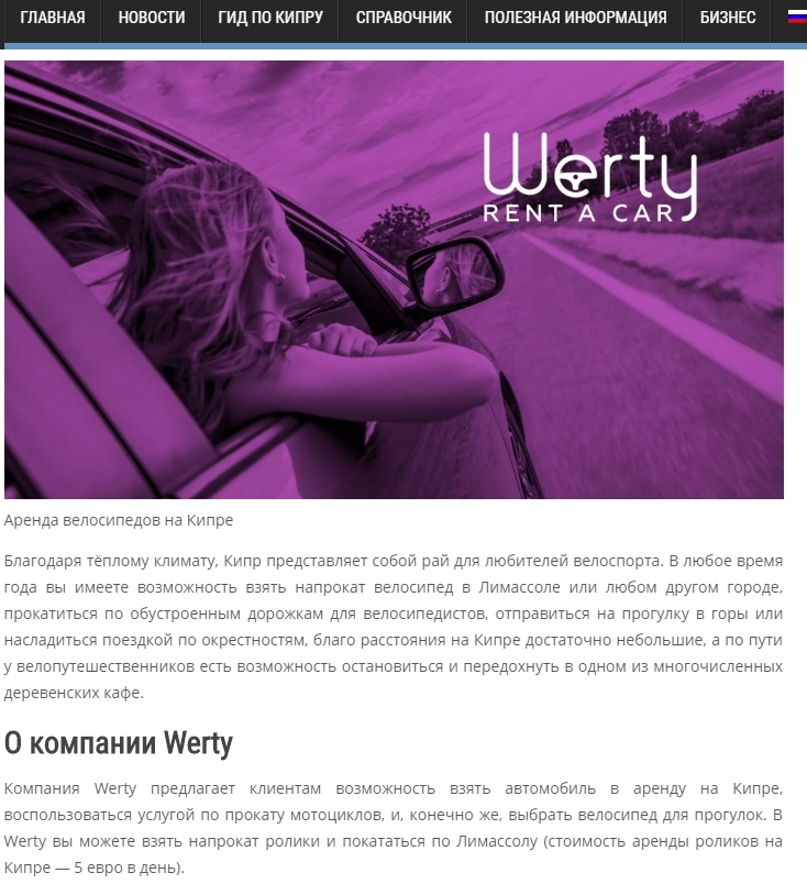 "Компания Werty предлагает клиентам возможность взять автомобиль в аренду на Кипре, воспользоваться услугой по прокату мотоциклов, и, конечно же, выбрать велосипед для прогулок. В Werty вы можете взять напрокат ролики и покататься по Лимассолу".