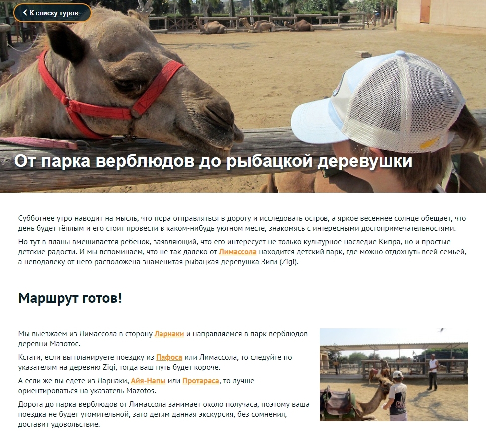 "Субботнее утро наводит на мысль, что пора отправляться в дорогу и исследовать остров, а яркое весеннее солнце обещает, что день будет тёплым и его стоит провести в каком-нибудь уютном месте, знакомясь с интересными достопримечательностями". (Read more at: https://www.kiprinform.com/cyprus_tours_drive/ot-parka-verblyudov-do-rybackoy-derevu/)